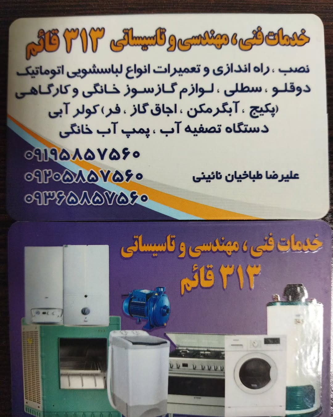 مجموعه «خدمات فنی مهندسی و تاسیساتی ۳۱۳ قائم» به مدیریت آقای علیرضا طباخیان نائینی با ارائه خدمات تخصصی در حوزه نصب، سرویس و تعمیر انواع پکیج، لوازم گازسوز، دستگاههای گرمایشی و تجهیزات خانگی در تهران فعالیت میکند.